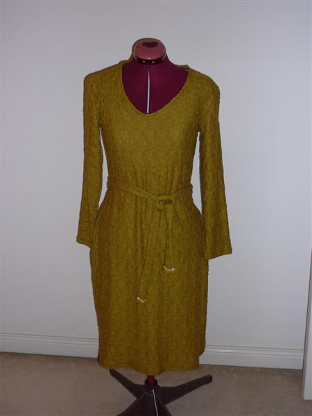 The green fabric is a piece I bought at the latest Tessuti’s sale. The fabric has a bubbly surface and has good memory, so instead of making a hip length v-neckline top, I extended it over my rump and now it’s a dress. The main measure I used was to add more fabric so that it would pull or look embarrasing. It worked and this time the dress took 2 hours from cutting to the final neckline finish. I used seams great on both the shoulder seams and neckline for more stability. Now to wear the dress and keep an ear out for the wolf whistle…