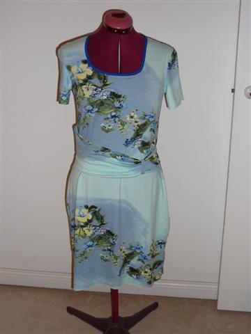 I bought this fabric after a nine-day stay in Hawaii five years ago. It’s got two-way stretch and good memory. The fabric has some weight to it so now it’s a t-shirt dress with it’s own belt.