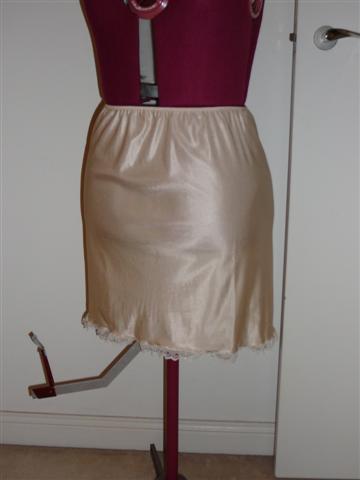 The problem was static cling (no picture required here) with my stockings. I felt like a cling wrap piece of chicken. In desperation, I found a stash of tricot knit that I bought at a factory clearance, measured my widest hip measurement (derriere) and cut the fabric so it was above the knee.