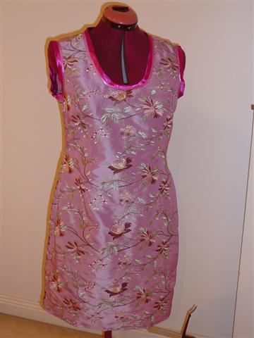 On the technical side of this dress, I’ve used an invisible zip, bias fushia tape on the neck and arm edges, pink trim to balance the colour. I’ll use the remaining fushia tape to finish the dress hem on the inside and put a vent in the lower side seams.
