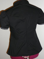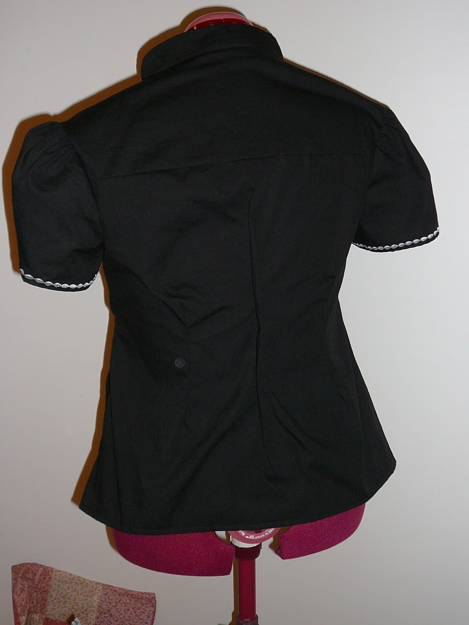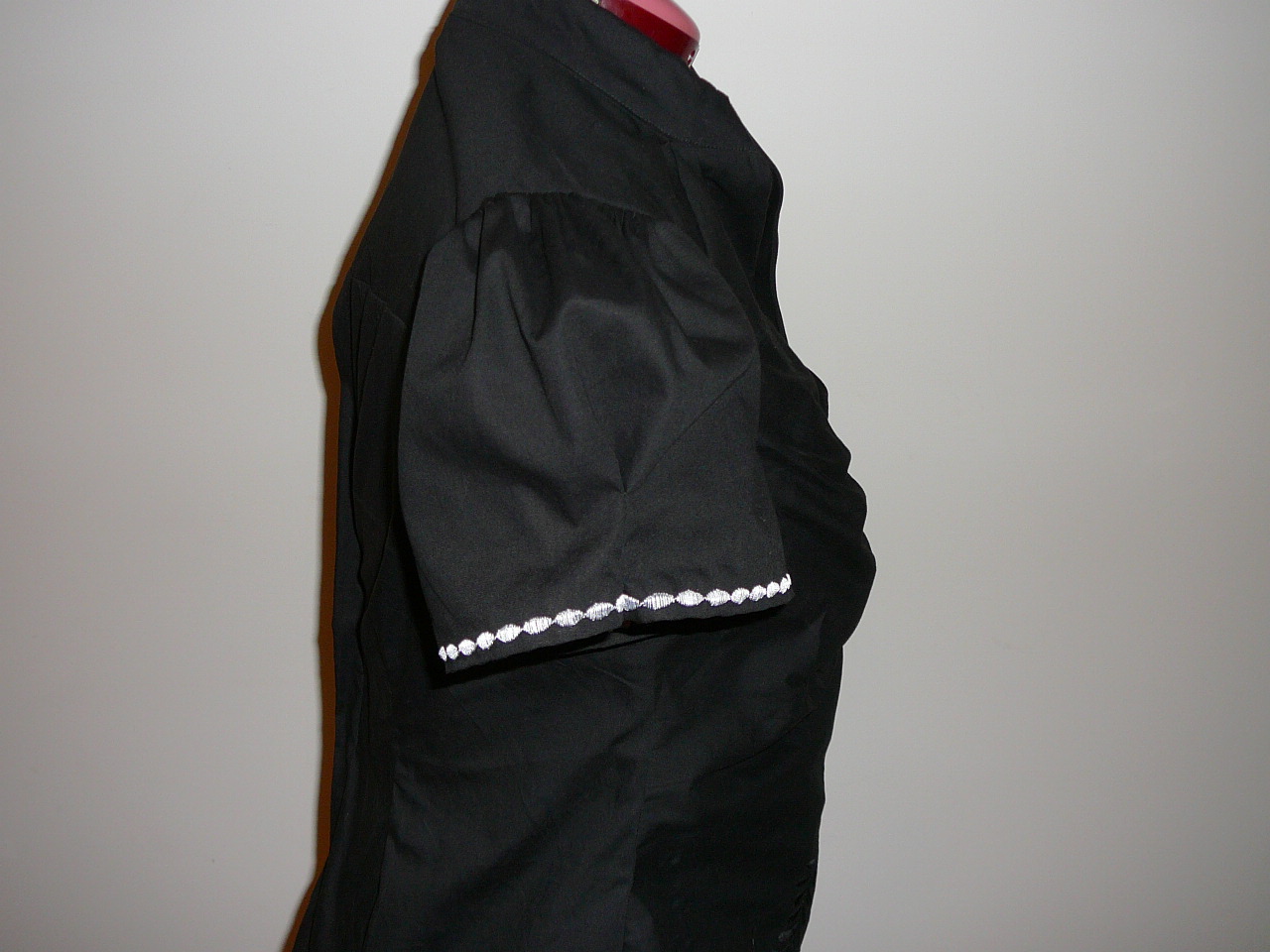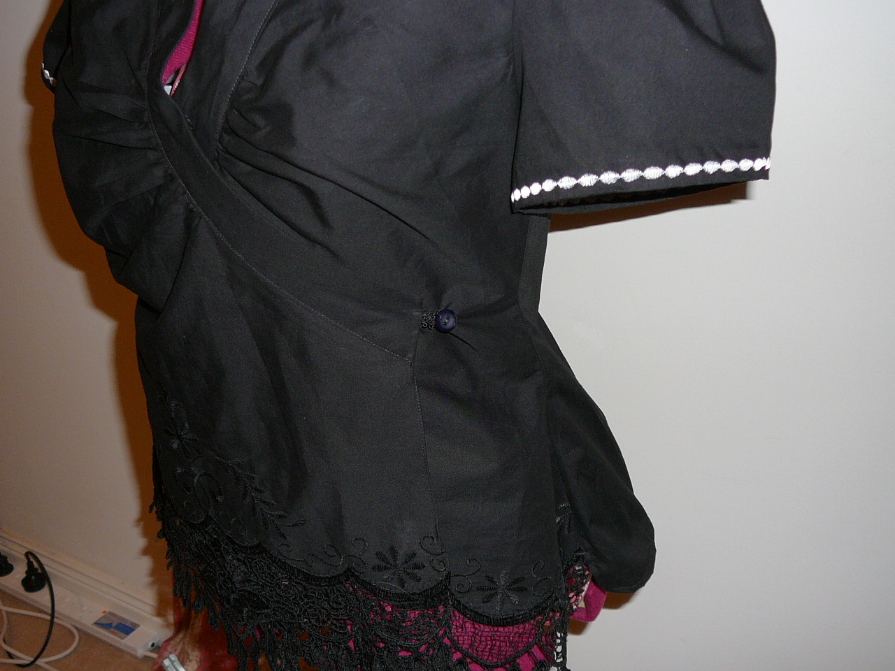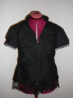 The embroidery border is only placed on the front panel and I’ve matched it on both left and right panels. I’ve used black buttons instead of ties to keep the shirt on, rather than have it slip off.