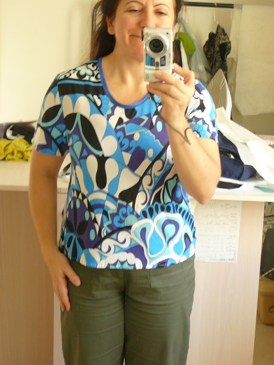 This was the first top I made today. There’s no science in the pattern placement and the neckling on the pattern was tight around my neck, so I’ve dropped it a bit.