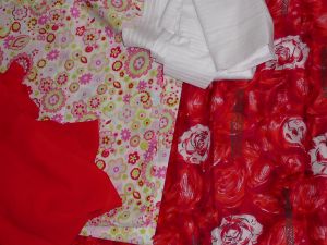 The basic red fabric might work with the Vogue skirt. The white print could be a sleeveless top, The red print with white roses is a silk that could work as a dress or a slim line skirt. The white cotton would be a second top. The knit dress is just one that I could work on in a dark wine knit to keep my motivation going.
