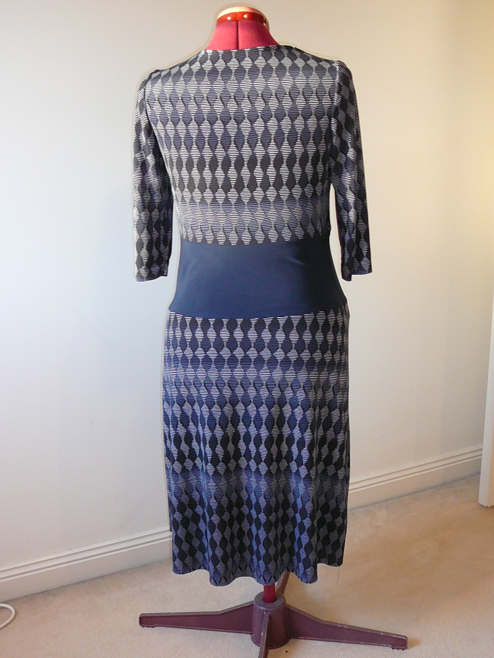 Our weather is still warm but not humid anymore, and it’s autumn. This knit dress is a Palmer/Pletsch classic fit that has some really good reviews on Pattern Review, so I used this blue printed knit bought at Lincraft (50% off) in February ($6).
