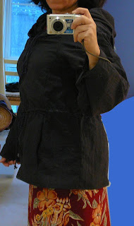 I combined views B and C, so I have the collar and hoodie for a challenge. You can also see that I used a chunky plastic zip and cord. I hand stitched the zipper in before machining it in, so that it wouldn’t slide around, if I just used pins.
