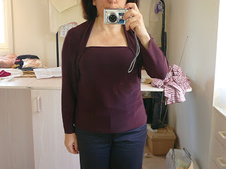 This is the finished top with a bit of sewing to keep the bolero piece sitting over the bra straps underneath. I will rejig this adjustment so that there’s no billowing fabric at the sleeve seamline.