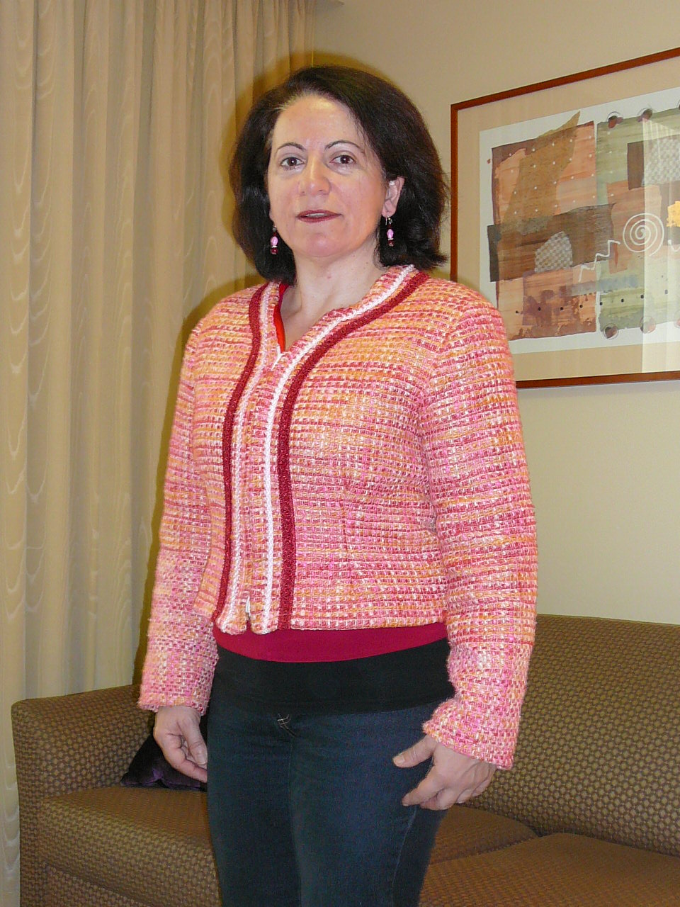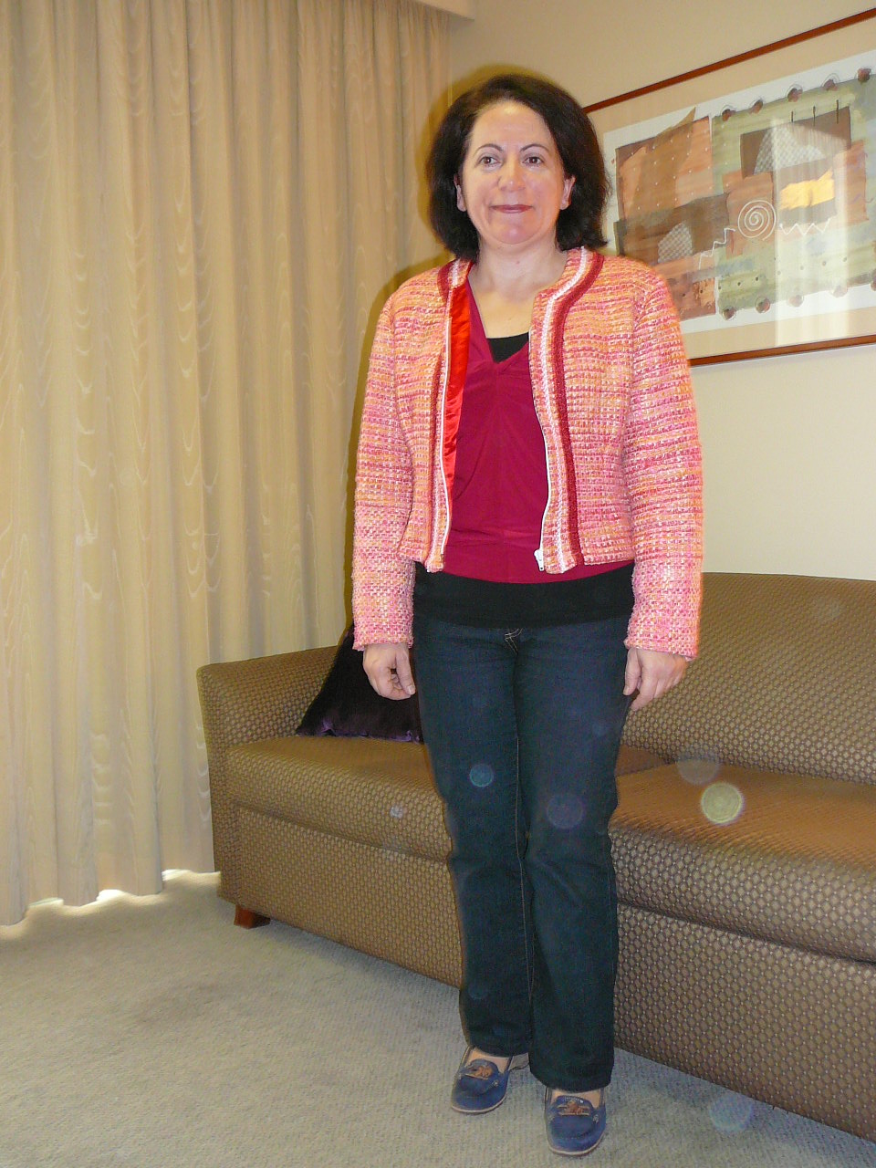 Here’s how I wore Chanel #1 on Jeans for Genes days for work. The top underneath is Kwik Sew 3378 in a dark raspberry two-way stretch poly knit. The knit top and the jacket don’t crease and the top is an easy layer to wear.