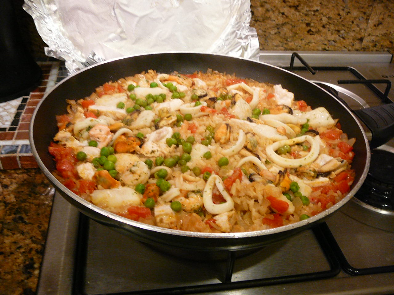 The secret action was to cover it with alfoil at the end and let it cook. I took it off the heat before the rice burned, which is a no-no, so next time I’ll leave it to burn a bit around the edges.