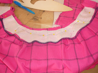 This shows how I lowered the neckline by using the facing, a blue pen and a french curve, to help line up the neckline better.