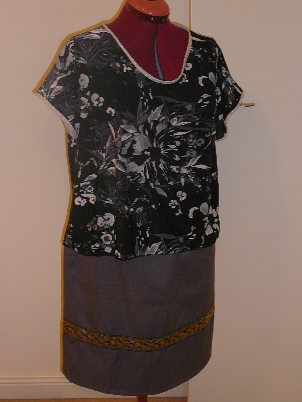 The first skirt that I’ve made is a lined straight skirt, with an elastic waistline. There is a split at the centre backhem so she can get in and out of the car, without her movements being restricted. It’s a mid grey colour to match her favourite walking shoes. We joke that these are her everyday heels. I’ve also added a thick trim near the hem that I’ve had for a while. The trim has black gold and silver threads. The skirt base is Lincraft 1082 which is at least 10 years old, and I’ve taken out the darts and I’ve folded down the waistline to make the elastic casing..