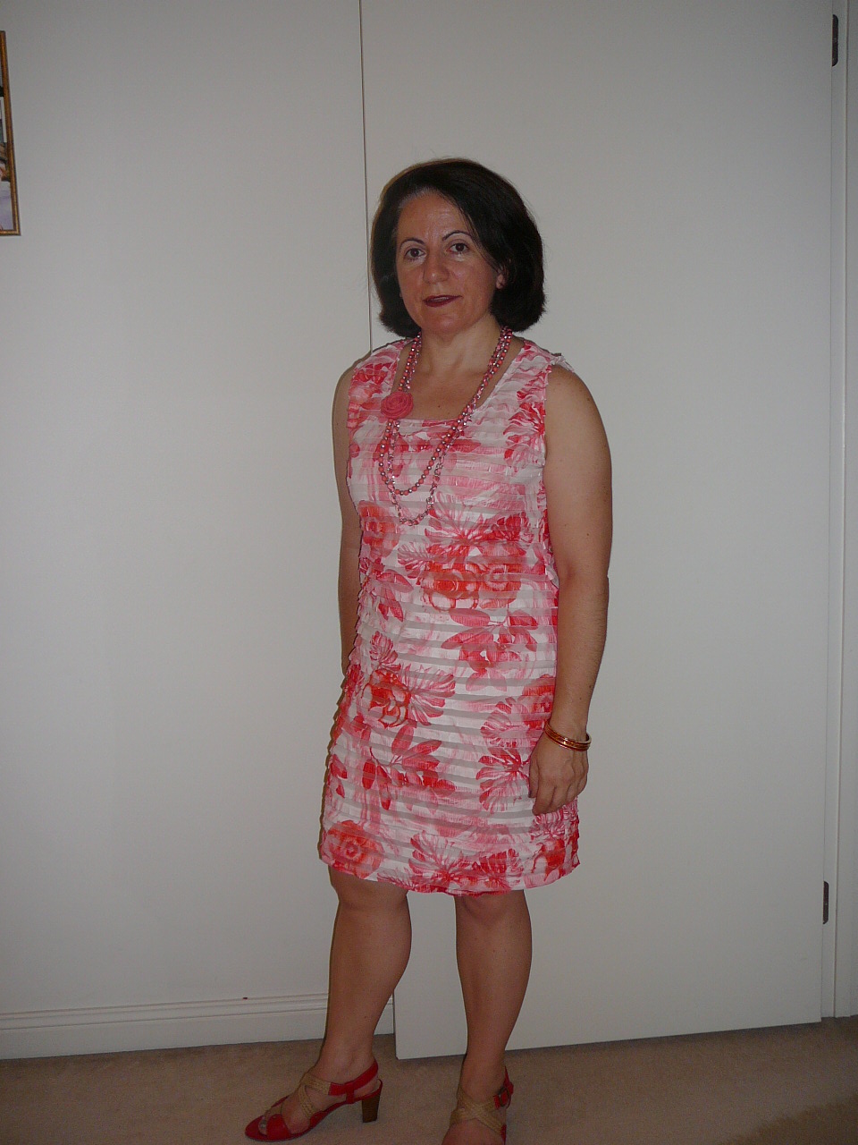 Most of my knit dresses are work dresses so they are so not festive or bright. At the Remnant Warehouse I picked up a bright coral printed knit and decided to be bold.