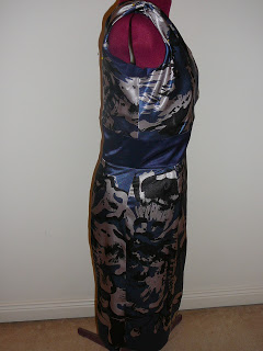 On the left the armhole will be finished with a bias strip in the printed fabric. On the right I’ve since adjusted the top of the zipper (see the yellow pin) to overcome the gap. The hemline was at the right level so I also need to handstitche the lined bodice and centre back vent.