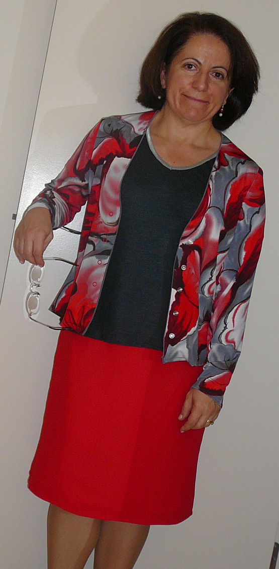 The red skirt had been an orphan but now it looks like it’s part of a family. The sleeves are long so I will look at adding some gathers on the next cardi, if the fabric is a solid colour.