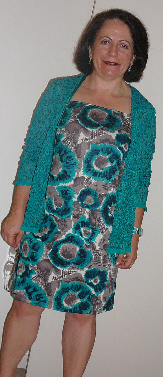 Lovely dress, the teal is very nice on you.