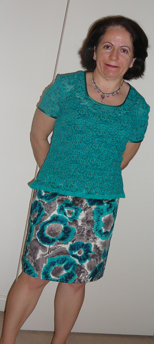 The skirt pattern is the leftover piece from the summer dress I made the for church part of the wedding last week. It’s my favourite Butterick 3597 and it’s not lined. The top is also a left over piece of the teal/green cardi M5978.