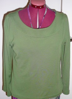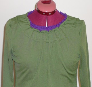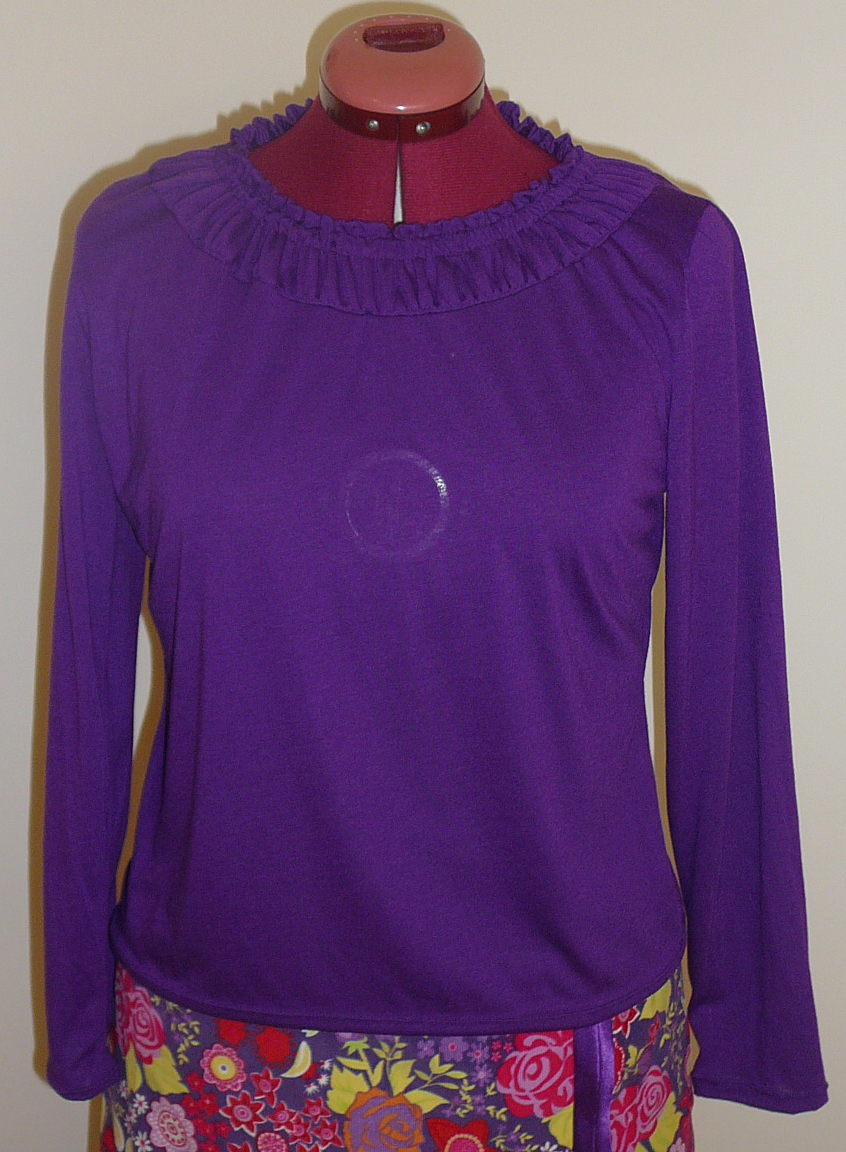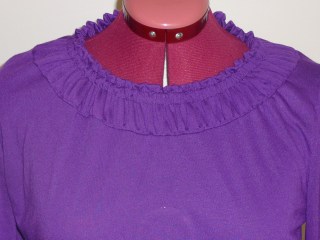What you’ll notice is the centre front gaps forward. My solution was to make this fit with gather stitches. Below is the effect the additional gathering stitches had on this top.  I used Kwik sew 3617 view A but then did the gathers because view B has ruching neckline. Now for the purple top story…