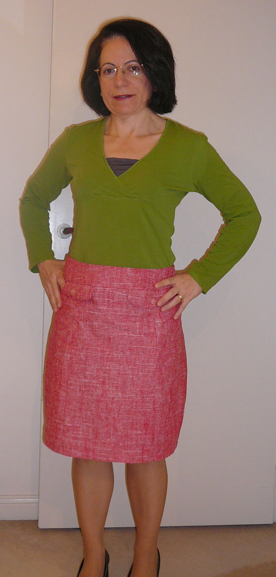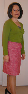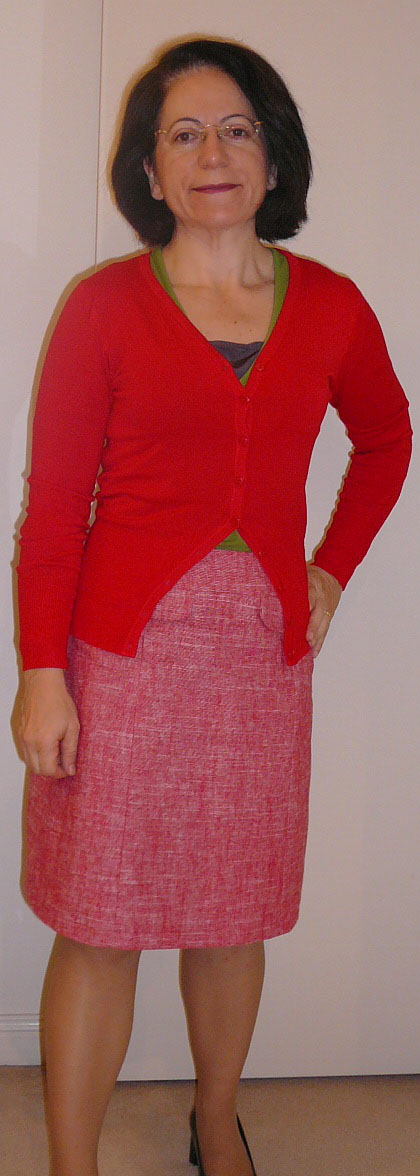 I love these kind of tweedy fabrics too. I usualy make jackets from them, but your skirt looks so nice, I may make a skirt too someday. It looks great with both the cardi's you show (avacodo green and red do not remind me of Christmas) and I can imagine it worn with so many other tops and jackets.