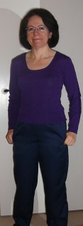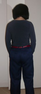 I took the fullness out of the pattern leg and there was still fullness at the back legs. The VPL was embarrasing so I refitted the back pockets for more room. I’ve finished the pants with belt carriers because I just wanted these pants finished without a glaring butt. I don’t like UFOs so I’ve tried to make this work.
