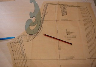 The blue pen shows the back leg width extension. The pencil shows the extended back crotch curve.