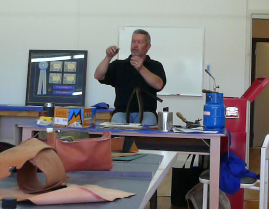 | Ian demonstrating handstitching leather. |