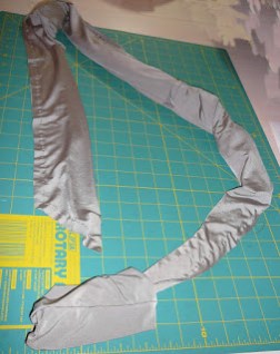 Then the bodice pieces are rolled or stuffed into the scarf piece so you can sew the scarf top, right sides together. I pinned the fabric away from the original stitching line so I would catch any bodice pieces in the process.