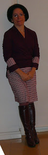 Cardi – Simplicity 2603 burgundy rayon knitDress – Vogue 8379. I’ve used the burgundy rayon as a sleeve cuff on the striped dress.