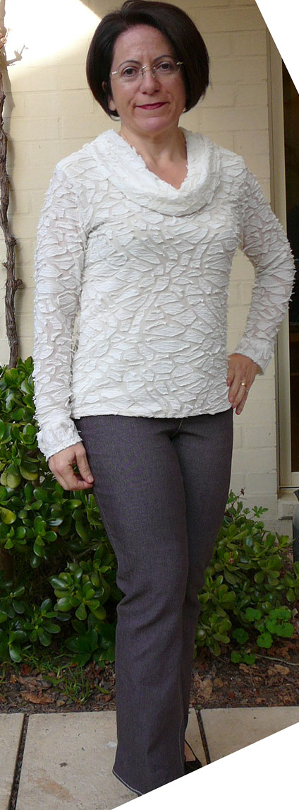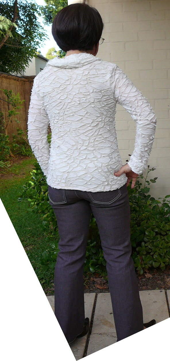 I love your terrific tops, the ruffle type fabric one really takes my fancy. I somehow have no cowl top patterns, but am suddenly thinking I need to fix this problem.The drape of your collars is just right in all the different fabrics, very nice.