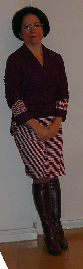 Cardi – Simplicity 2603 burgundy rayon knitDress – Vogue 8379. I’ve used the burgundy rayon as a sleeve cuff on the striped dress.
