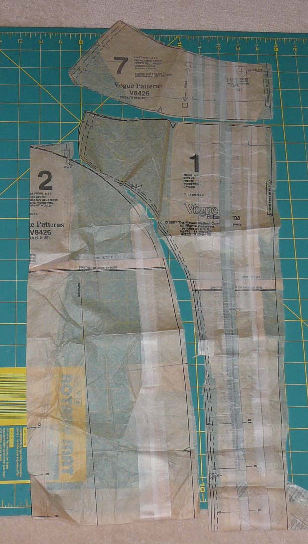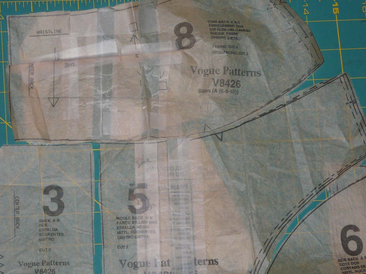 The main area that needed adjusting for the sway back was in the back pattern pieces. I did a bit of thinking and research before I had the guts to make this adjustment. Sherry does a good explanation about sway back analysis and adjustment.