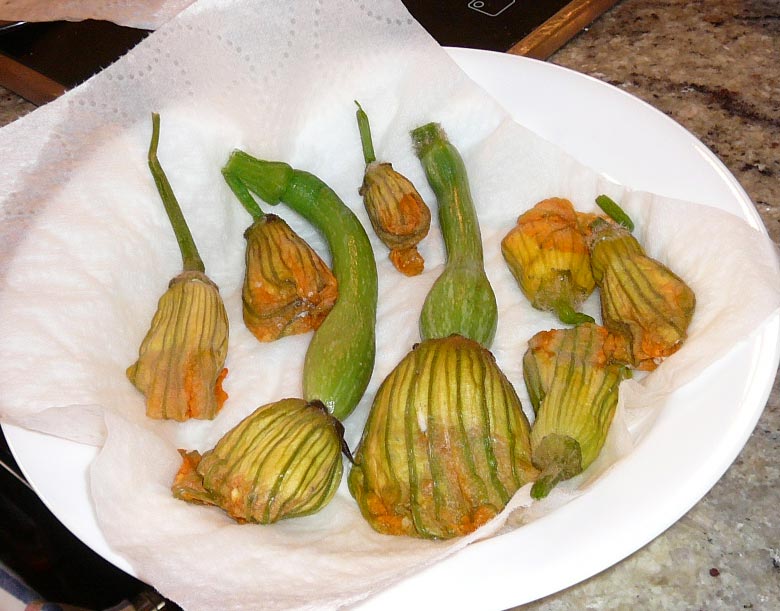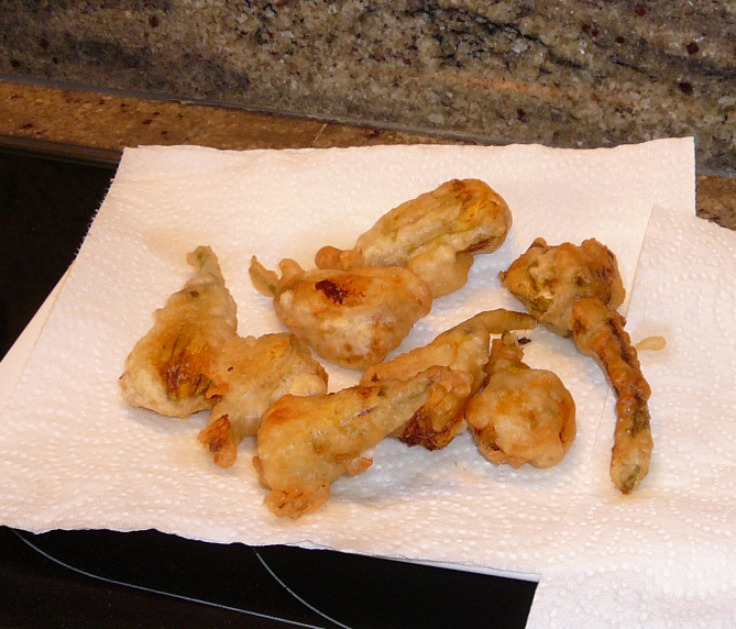 Use a small saucepan with frying oil to lightly fry the batter dunked zucchini flowers and drain them on paper towel.