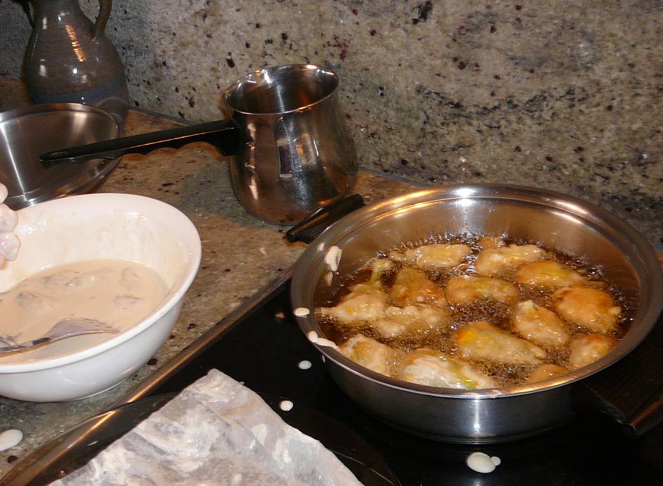 I can only give you part of this recipe because the cheese/mint filling was already inserted into the frozen filled zucchini flowers when I was helping GM.