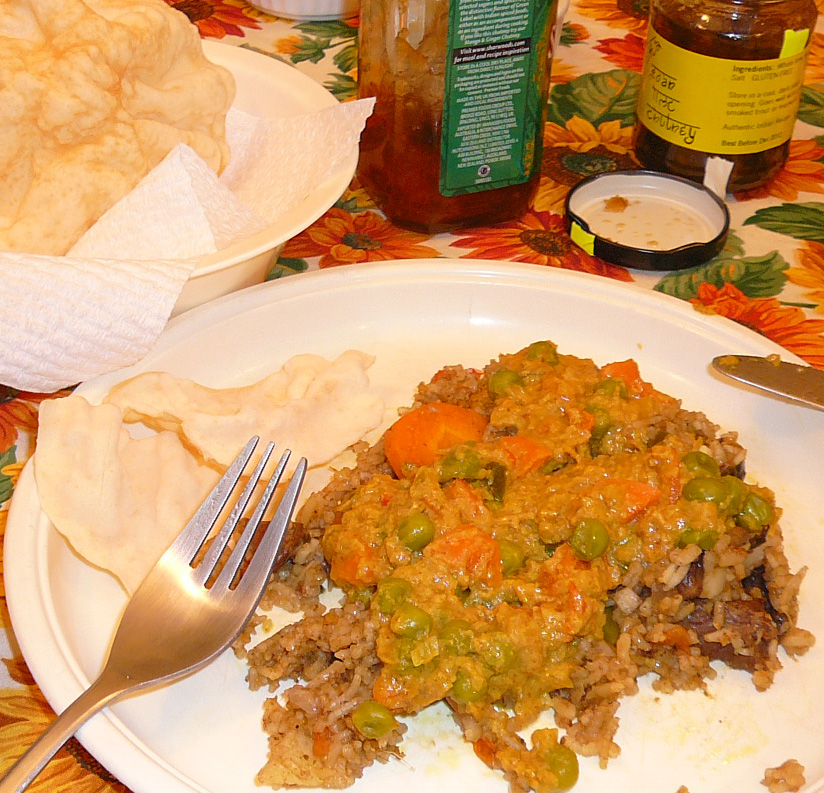 The poppadoms (bought from a local Indian grocer), the mango chutney and lime chutney made more authentic for us.