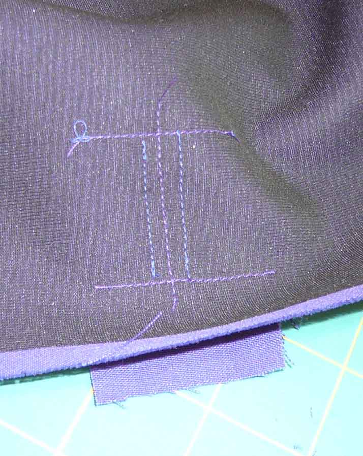 Then I used Sherry’s method. While this was my second ever bound buttonhole, I felt more confident sewing with the basting guidelines. pencil lines would hsve worked too. I used a zipper foot for these buttonholes. The buttonhole was slimmer and flatter. What you see below are the basted guidelines and it looks messy but this worked for me.