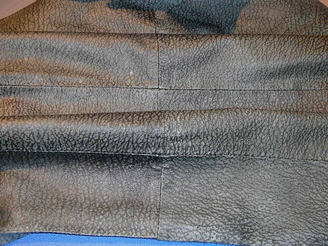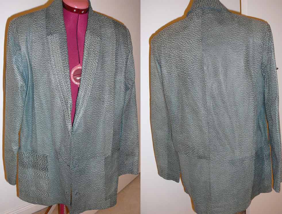 When I unpicked this jacket, the glue on the seams was still good but I could rip it apart without tearing the skin. Twill tape was used on the sleeve joins to the jacket, in the hem and in the side seams. The buttonholes were reinforced and the self cover buttons had a small button on the wrong side to hold them in place. It’s a big big jacket so it would suit a ‘simple’ straight skirt.