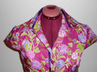 The close up shot below shows a hint of flowers on the inside at the neckline. The last minute facing worked. Every seam is either french seamed or self-made bias bound. And I added the purple bias for colour and a vertical line. We petites know why.