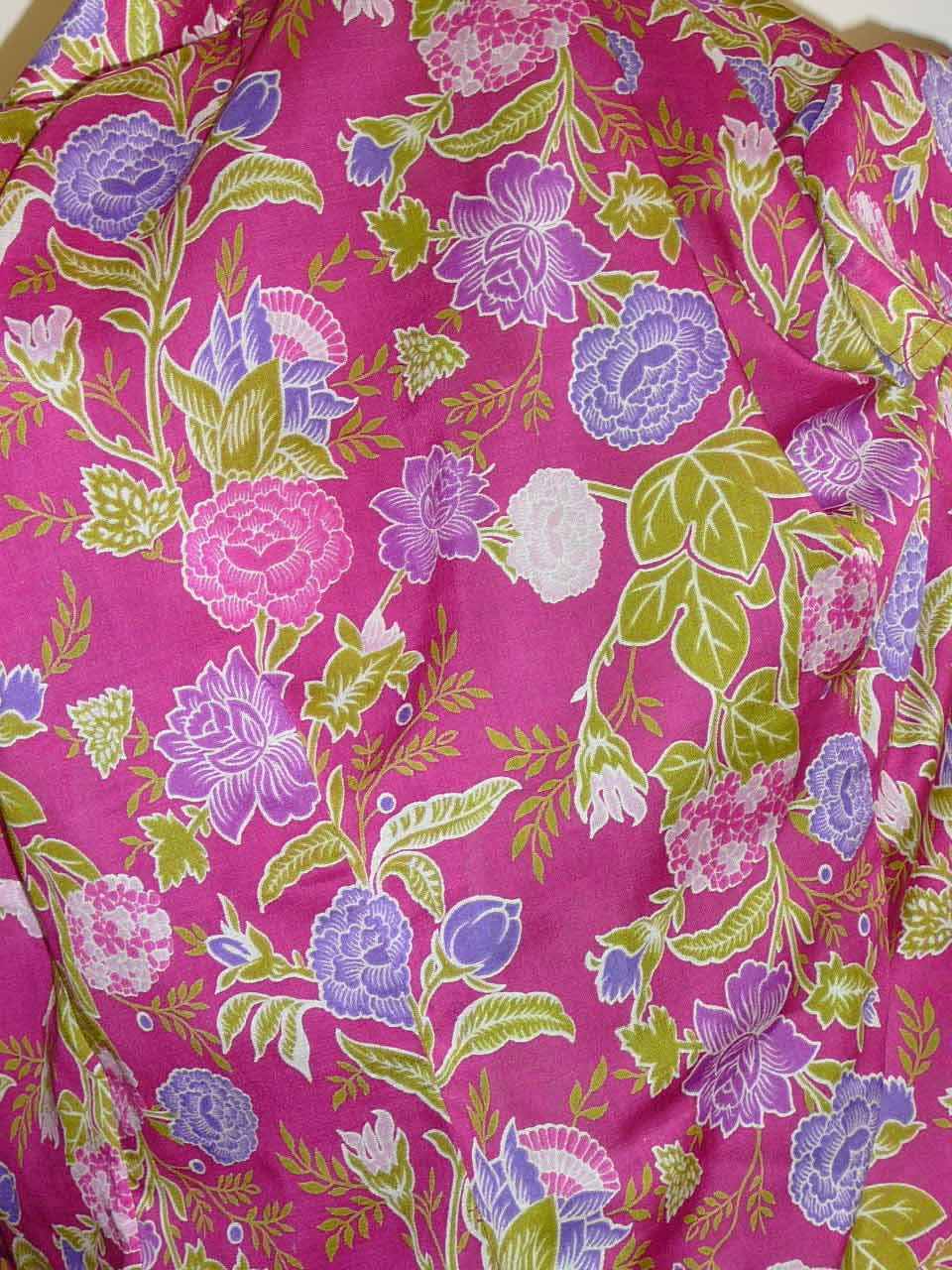 The close up shot below shows a hint of flowers on the inside at the neckline. The last minute facing worked. Every seam is either french seamed or self-made bias bound. And I added the purple bias for colour and a vertical line. We petites know why.