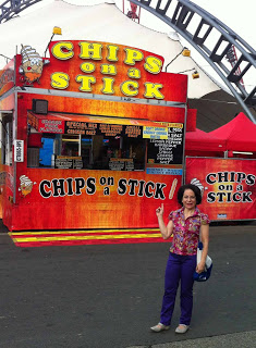 Loving the purple pins. Great job (as usual). I can't say that I have heard of chips on a stick – I mustn't get out enough. All up a great outfit when teamed with your lovely spring shirt.