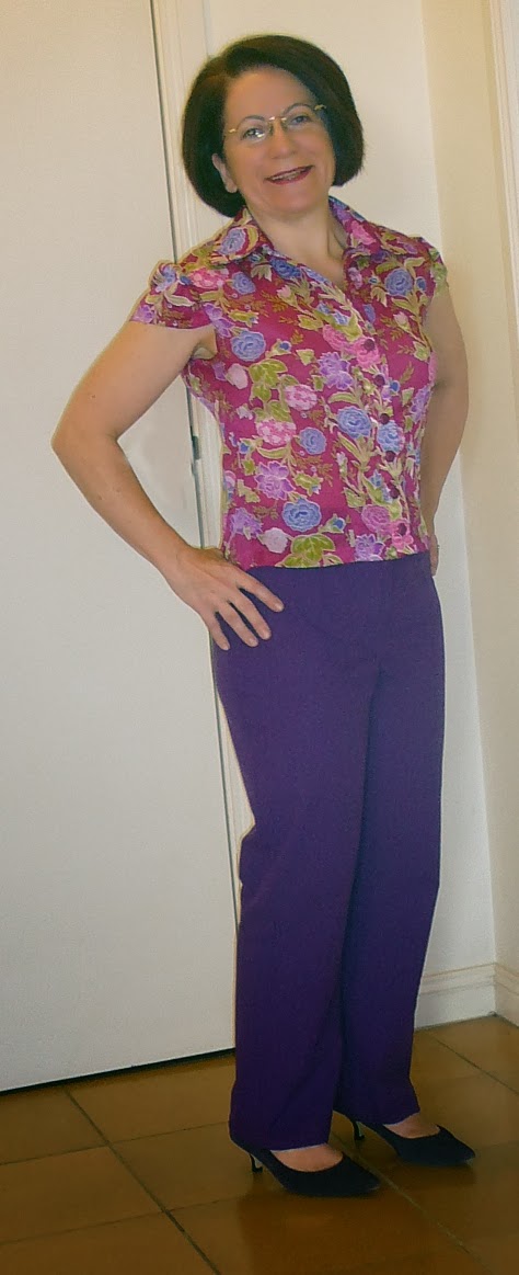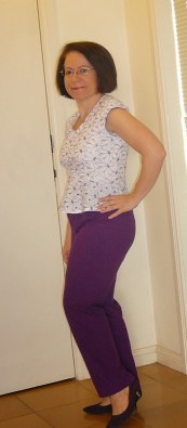 2. Nice! Love the colours on you and the print is very pretty. The pants are awesome too. You did say you were 'going purple' 😉