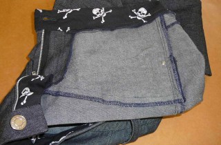 The Minerva kit has everything you need for these jeans – Vogue 8874, Top stitching thread, great black non-stretch denim, woven interfacing, the inside skull print fabric, a very secure metal zipper and the ideal metal jeans button and rivets.