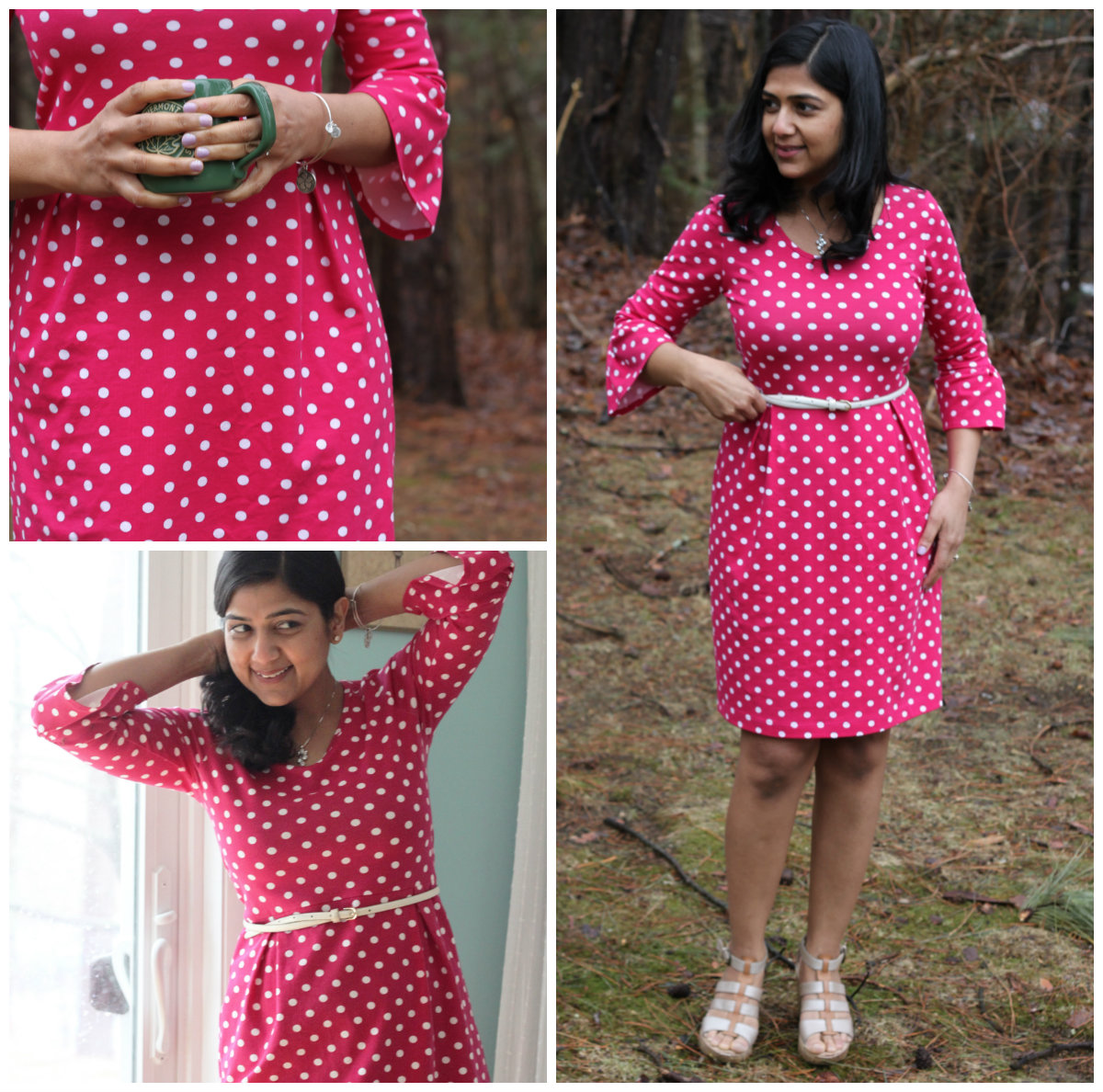 Winter Street Dress is an easy to sew knit dress with a waist seam and a narrow pleated skirt. The narrow skirt with inverted box pleats has just the right amount of ease where you need it, resulting in a very comfortable and cute tulip shape.