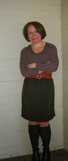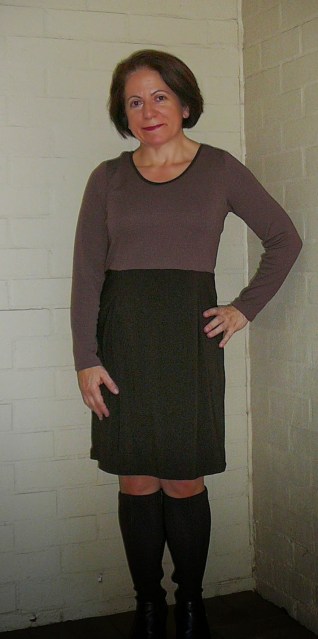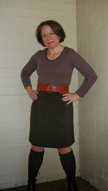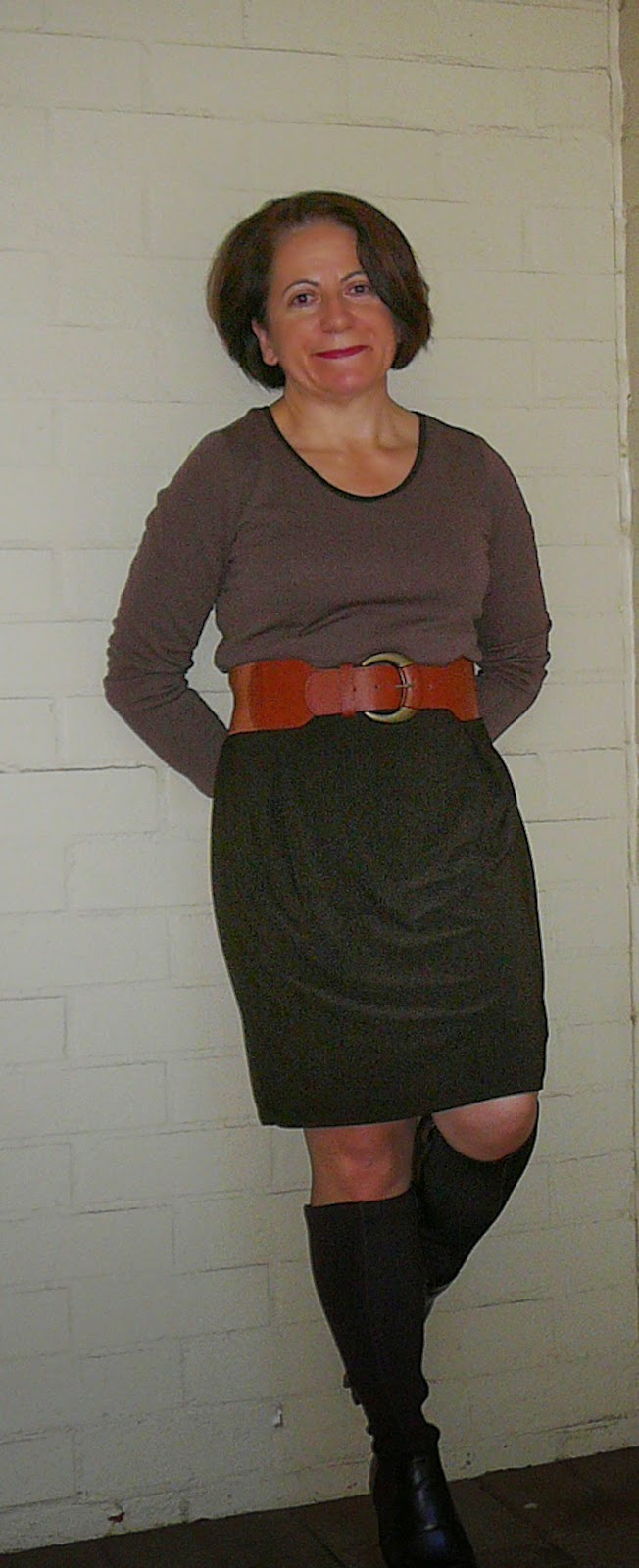 This is a fabulous dress. I love your choice of the two colors of knit, plus the belt and boots – just fantastic.