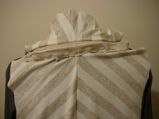 I did plan and make the hoodie but placing a zip on zip off piece across the back neckline didn’t work. The hoodie stripes on the outside are vertical and on the inside they are horizontal, so when I wear it, it becomes a hood/cape/collar.