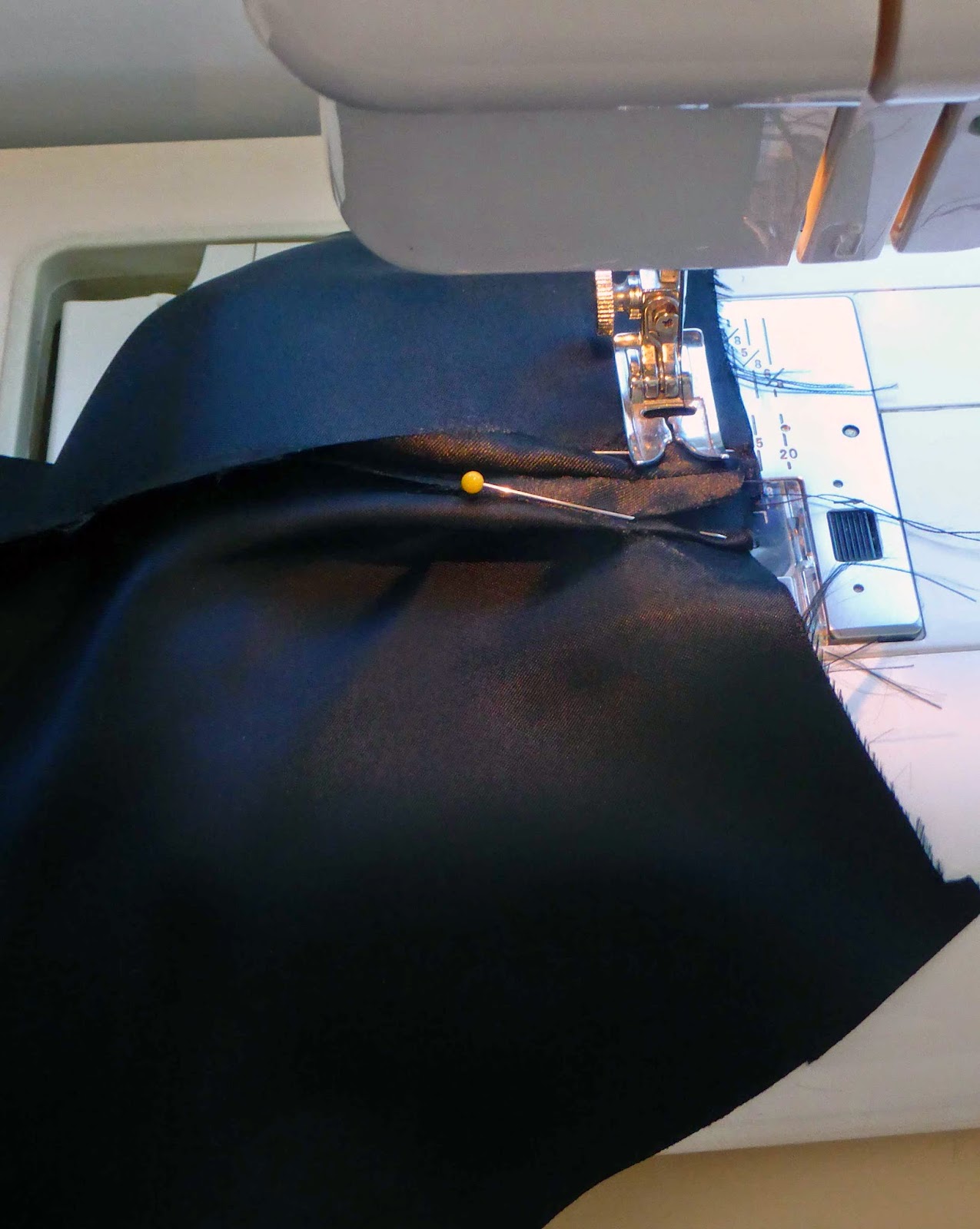 Sewing black fabric can be a pain to see so I use a dark contrasting colour thread to help me see and unpick seams easily. I’ve used brown thread on black in the lightened pic below.