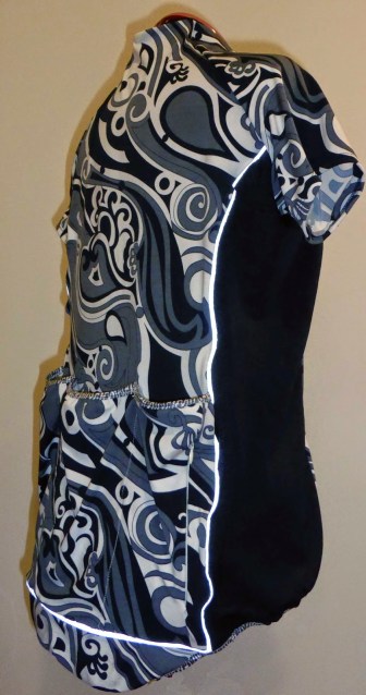 My fabric is ordinary poly/lycra knit. Nothing special. The fabric isn’t a gift. I did test this pattern for Melissa and I added a few ‘bits’ to it – reflective piping and hidden pocket.