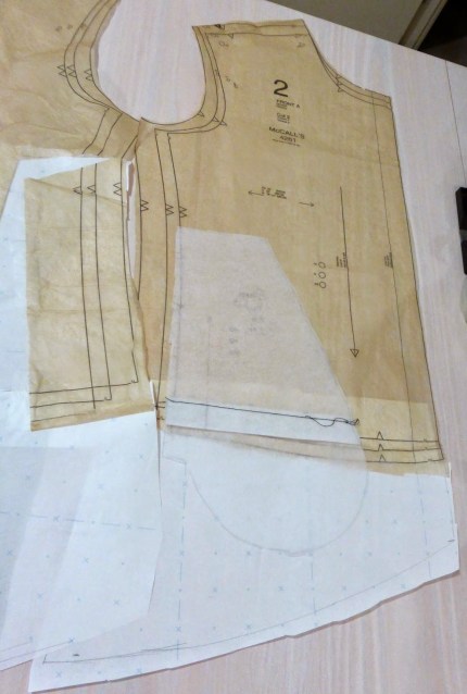The picture below shows the front jacket hem extended with a slight amount of added width for my hips. I’ve overlayed the new pocket piece and checked the pocket placement and depth at the side seam.