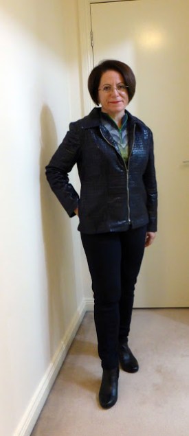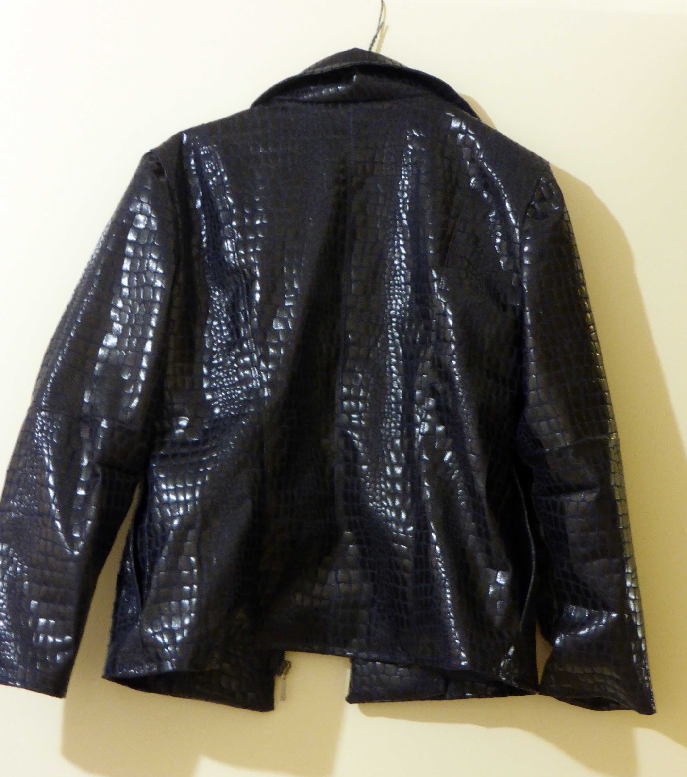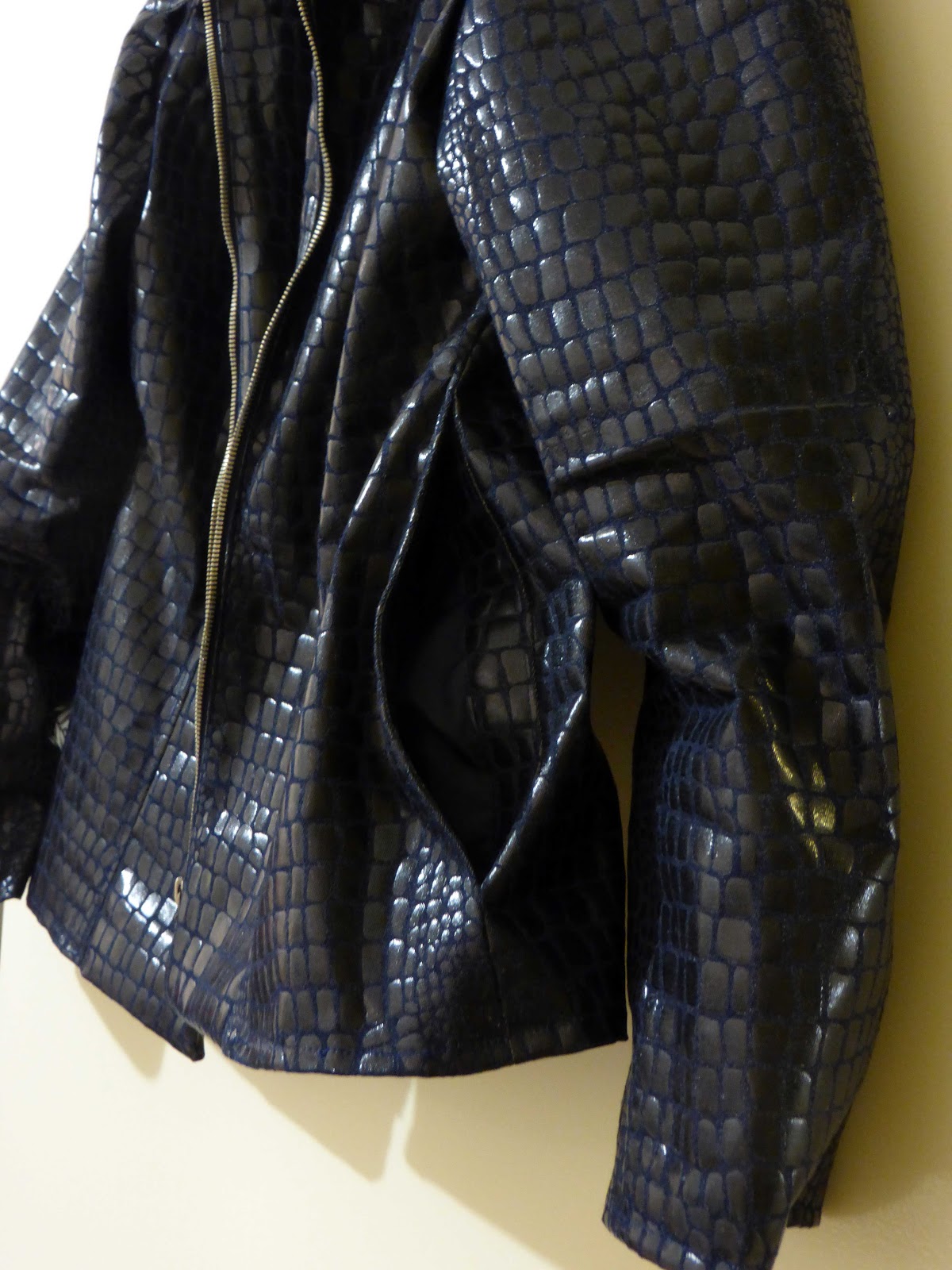 At least five years ago I bought this croc-resin stretch woven denim locally with a zipper jacket in mind. And here it is.