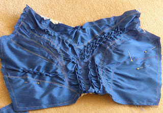 The cotton under layer fabric was sewn as per the pattern with the darts sewn. Then the smocked piece was over laid on it.