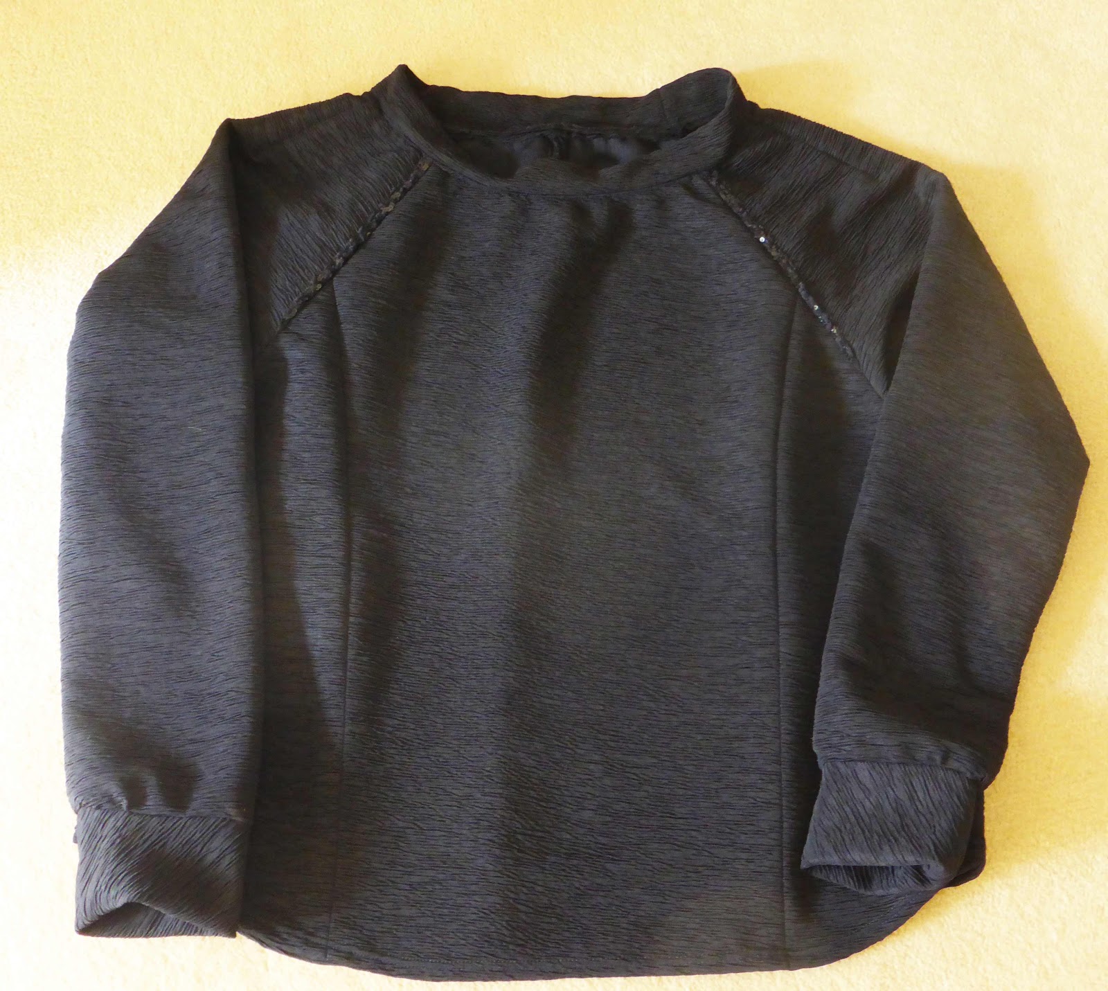 This textured knit hasn’t got much stretch so I failed with the neckband but added navy sequin trim on the front shoulder seams.