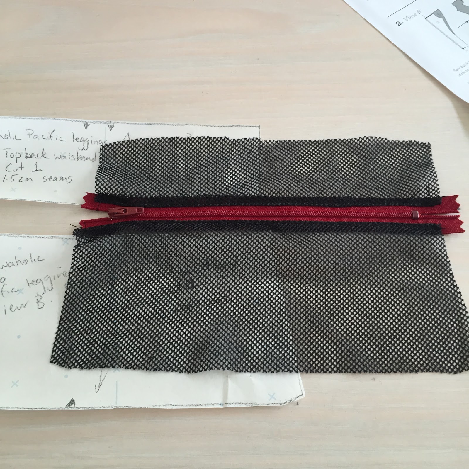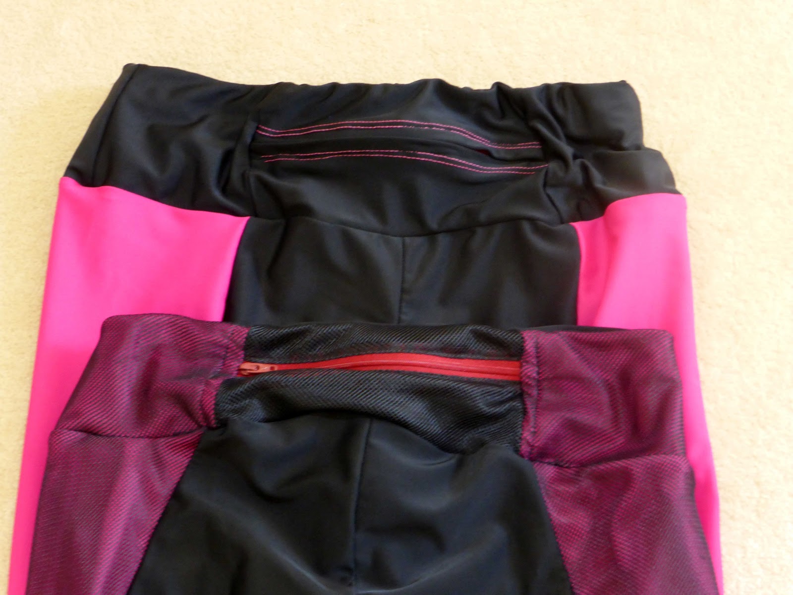 The beauty of Pacific leggings is you have 3 views you can ‘play’ with. In my case, the first pair (View A) used the plain waistband. The second version has the back zipper pocket and mesh and pink panels at the back.
