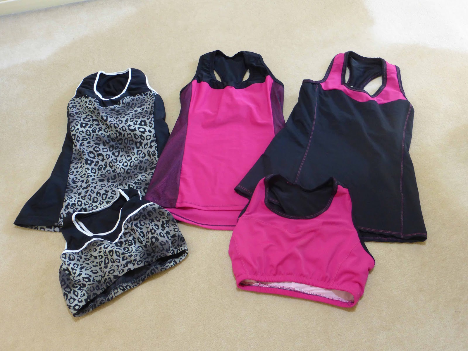 | Left to right: The prints are test versions. Pink mesh top, pink crop and black top wear really well. |